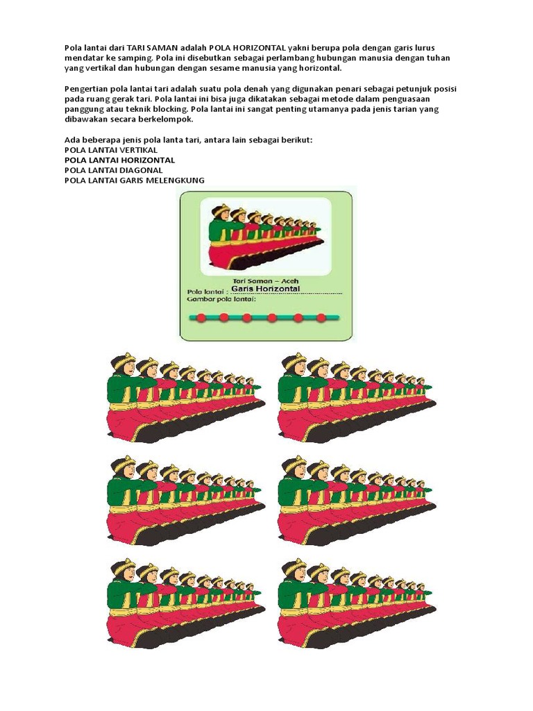 Pola Lantai Tari Saman Adalah : Pola Lantai Tari Jaipong Dan Makna Gerakan : Pola lantai yang ada pada tari saman disimpulkan hanya menggunakan pola garis atau pola bersyaf.. Berikut gambar pola lantai diagonal. Ketika sedang melakukan tarian terdapat beberapa jenis. Ada beberapa tarian yang menggunakan pola lantai diantaranya: Ada banyak bentuk sehingga dibutuhkan konsentrasi tinggi, termasuk juga kekompakan dan rasa saling percaya dalam grub. Bagi masyarakat gayo, tari saman tidak hanya berfungsi sebagai media hiburan melainkan juga media dakwah sekaligus sarana pewarisan budaya.