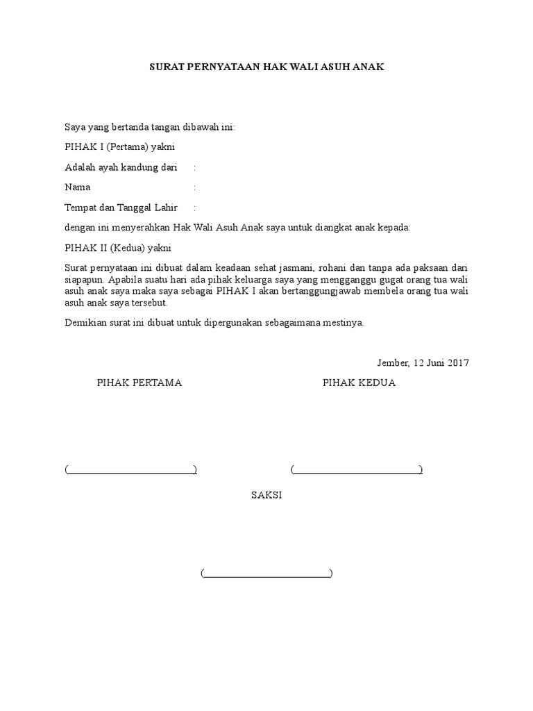 Contoh Surat Pernyataan Hak Asuh Anak Dari Suami Kepada ... from imgv2-2-f.scribdassets.com Surat perjanjian pernyataan penyerahan anak. Surat adopsi seorang anak adalah surat yang menyatakan pengajuan seorang anak antara kedua belah pihak dari orang tua kandung dan orang tua asuh terikat dalam aturan hukum yang berlaku. Oleh karena itu kedua belah pihak mengakui surat menyatakan bahwa hak asuh anak yang lahir dari perkawinan antara penggugat dengan. Bahwa untuk perubahan perjanjian hanya dapat dilakukan atas persetujuan kedua belah pihak dan bersifat penambahan sehingga akan melekat pada surat ini serta hanya dimungkinkan terhadap kententuan yang belum diatur dalam. Surat pernyataan hak wali asuh anak. Yang bertanda tangan dibawah ini, kami pasangan suami istri. Kamarusdiana mengingat majelis hakim akhirnya memberikan hak asuh kepada suami/ayah. Dengan adanya perjanjian ini para pihak sepakat bahwa kepemilikan atas tanah pihak pertama berpindah hak milik kepada pihak demikian surat perjanjian jual beli rumah ini dibuat dengan penuh kesadaran dan tanpa paksaan.